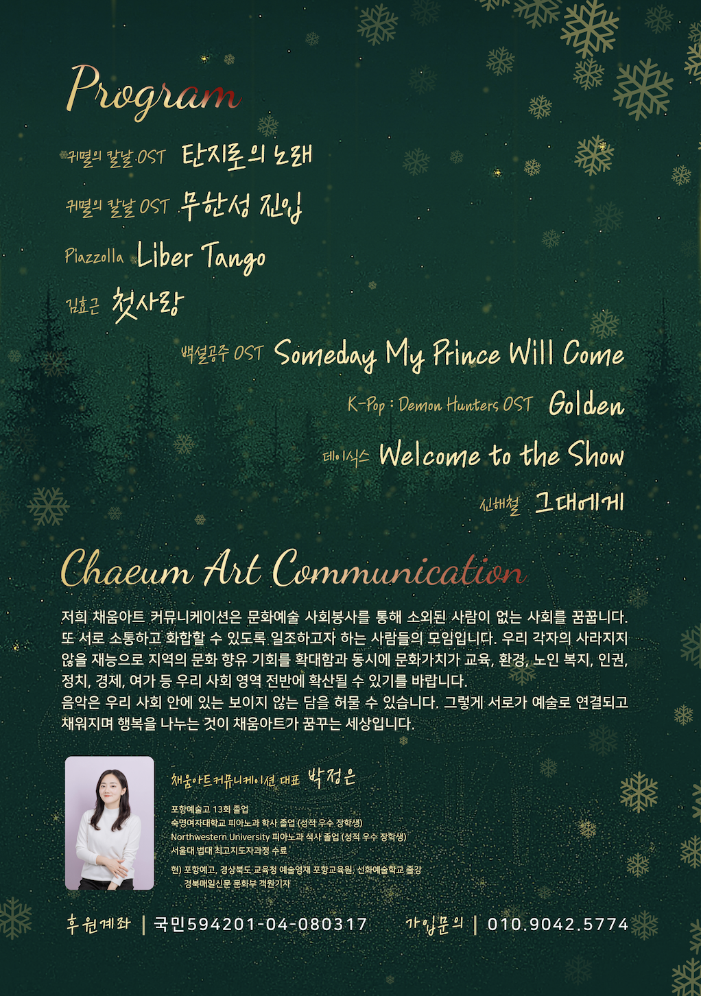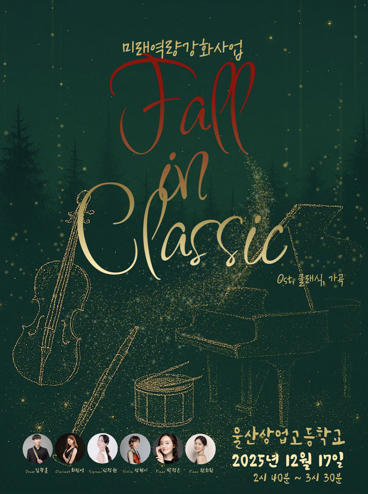 기말고사를 마친 학생들에게 음악에 기댈 수 있는 시간을 선물하는 연주회. 귀멸의 칼날 OST부터 피아졸라의 리베르탱고까지 다양한 레파토리를 준비중입니다.